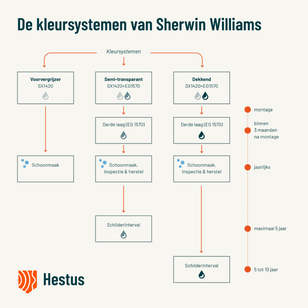Hestus werkt met de systemen van Sherwin Williams. Indien gewenst kan extra verf worden meegeleverd voor het behandelen van de kopse kanten, zaagkanten en voor het aanbrengen van de derde laag. Voor de derde laag raden wij aan om een professioneel schildersbedrijf in te schakelen. Zij beschikken over de juiste expertise, zorgen voor een nauwkeurige laagdikte en loggen hun werkzaamheden zorgvuldig. Zo blijft de kwaliteit, duurzaamheid en veiligheid van het brandvertragend behandelde hout volledig gewaarborgd.